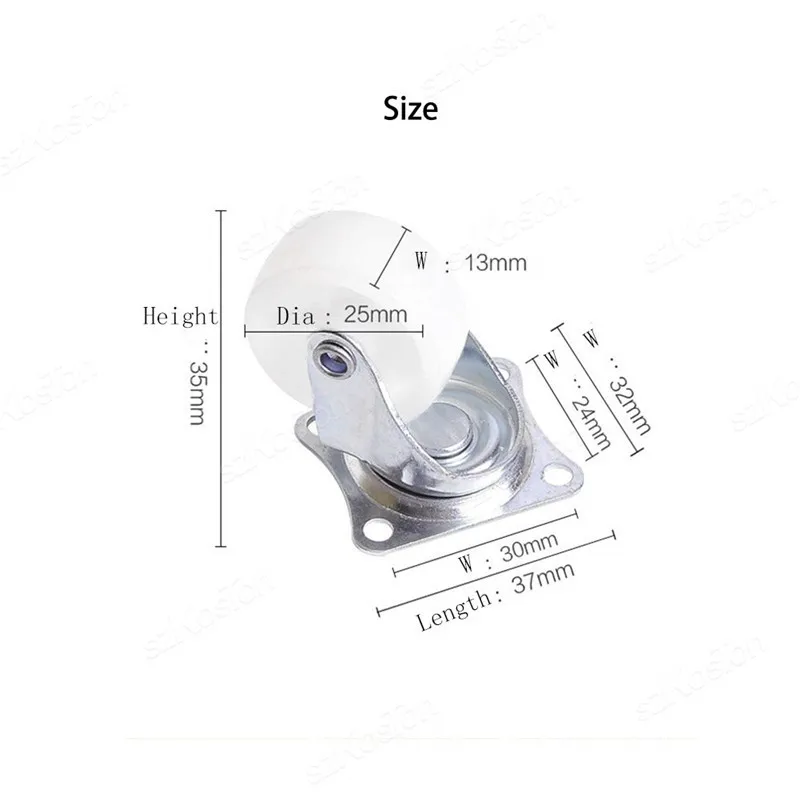 2. Wheel size – 25 x 13mm/ 1 x 0.51” (D*W). Wheel Height – 3.5cm/ 1.37”. Top Plate Size – 37 x 32mm/ 1.46 x 1.25”. Holes Diameter – 4mm/ 0.16”. Screw Size – 3.8 x 16mm/ 0.15 x 0.63”. Color – White, Silver Tone.